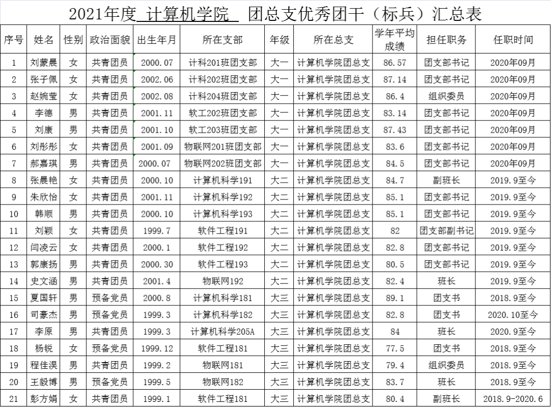 按照校团委《关于开展2021年度九游体育官网共青团先进集体和优秀个人的评比表彰》文件要求,计算机学院团总支已全部完成评比工作。各班级团支部依据支部投票结果评预推荐对象,学院团总支结合团支部青年大学习、主题团日活动、团员团干日常考核、团支部建设等情况,全面并根据上一学年考试成绩进行最终评定,确定最终推荐对象。现将拟订优秀团员(标兵)、优秀团干(标兵)、优秀团支部和星级志愿者名单进行公示。