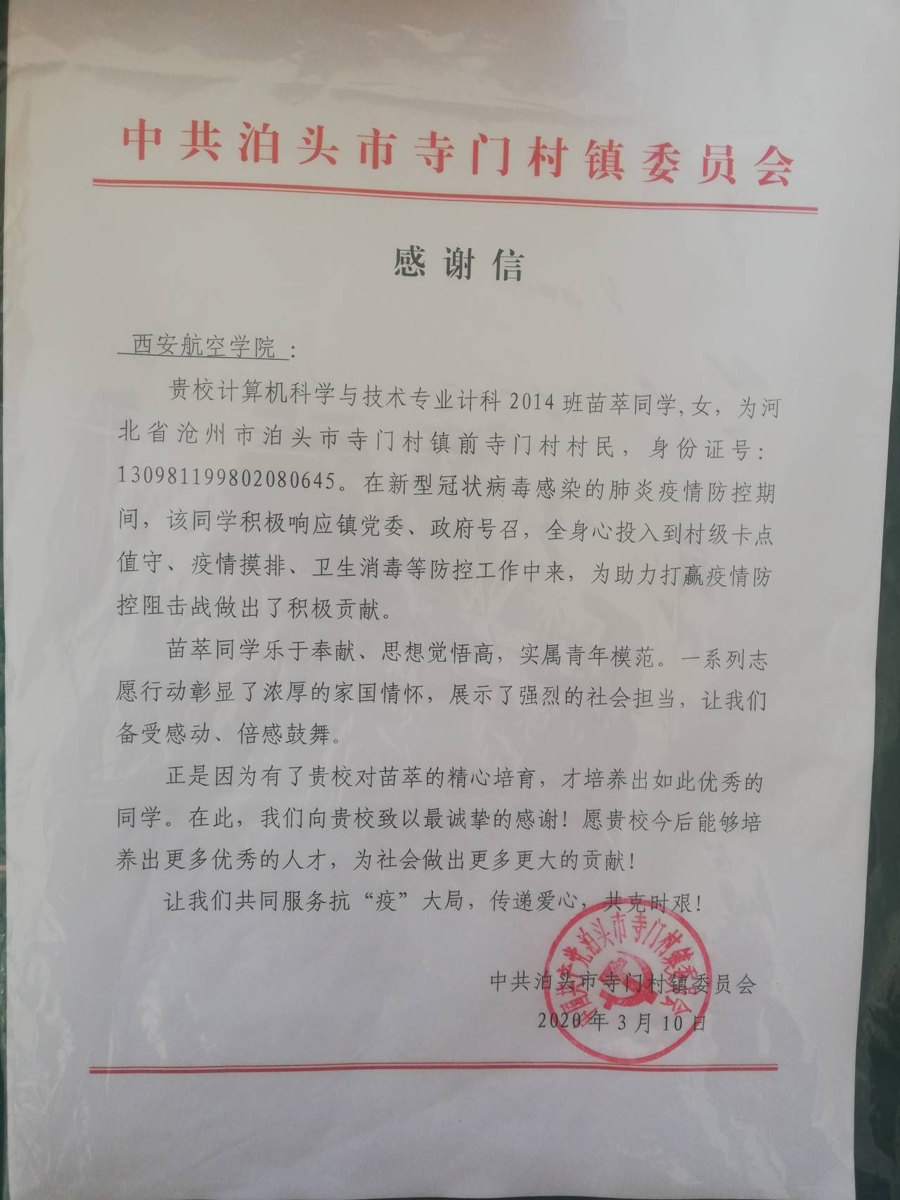 近日,九游体育官网收到一封来自河北省泊头市的感谢信,信中对学院计算机科学与技术2014班学生苗萃在疫情期间乐于奉献的精神和作为志愿者的优异表现进行肯定和赞扬,并对学院培养出如此勇于担当的学子表示感谢。