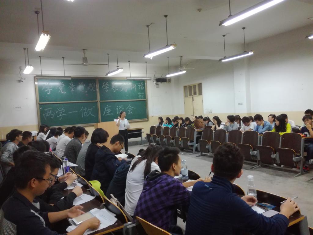 本次座谈会将75名党员和积极分子分为7个组,讨论题分别是:“如何深刻领会习近平总书记系列讲话精神的核心要义?”;“共产党员如何以实际行动做到‘保证党内团结’?”;“如何深刻理解习近平总书记系列讲话中坚持和发展中国特色社会主义这个主题?”;“结合实际,谈谈如何认识开展‘两学一做’专题教育的实践要求。”;“谈谈如何深刻领会实现中华民族伟大复兴的中国梦这个理想目标?”;“大学生党员对党性的理解及其自己应该怎么做?”;“谈谈为什么党员必须把学习党章作为必修课?”;“谈谈如何学习贯彻《中国共产党廉洁自律准则》和《中国共产党几率处分条例》,做一名合格党员?”。各组同学就自己的讨论题展开热烈的讨论,随后各派出一人面对大家进行全方位、深层次的发言,分享学习的心得体会后。