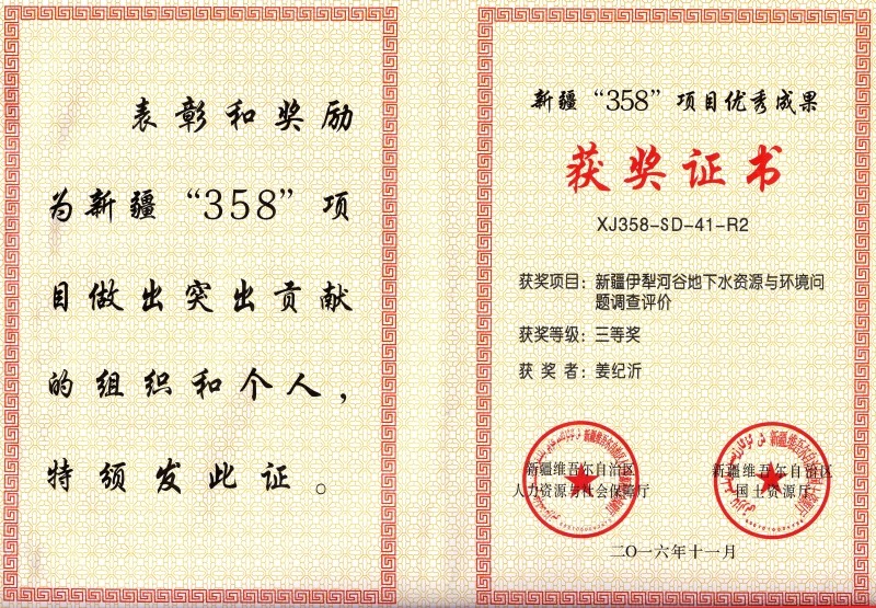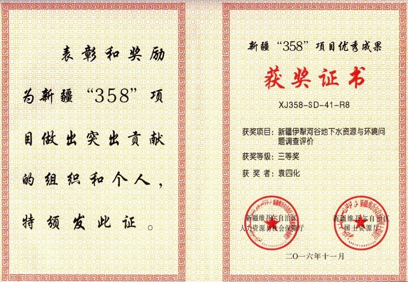根据新疆维吾尔自治区国土资源厅《关于新疆“358”项目先进单位优秀成果和先进个人的表彰决定》(新人社发〔2016〕156号),防灾科技学院作为第二完成单位参与完成的《新疆伊犁河谷地下水资源与环境问题调查评价》项目获得“新疆‘358’项目优秀成果”三等奖。该项目隶属于中国地质调查局实施的“西北大型盆地水文地质调查计划”项目,由中国地质调查局西安地质调查中心于2012年至2015年组织实施。