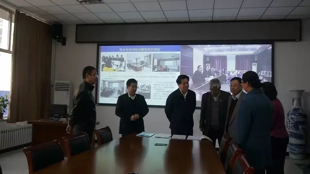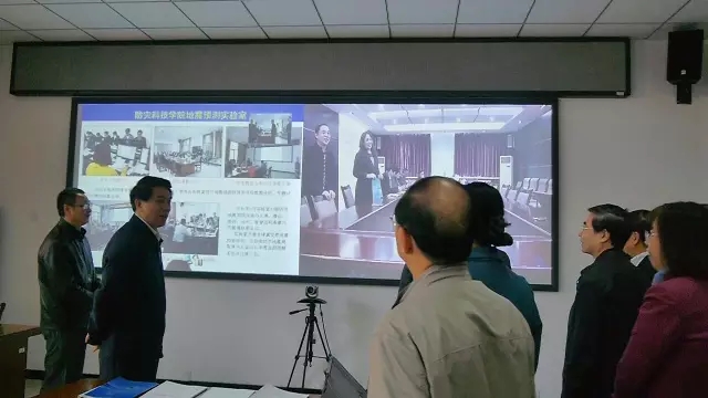 在地震预测实验室,郑国光详细了解了实验室的功能和开展教学科研的基本情况,还现场与廊坊市地震局模拟了实时会商,通过视频与廊坊市地震局的工作人员亲切交谈。