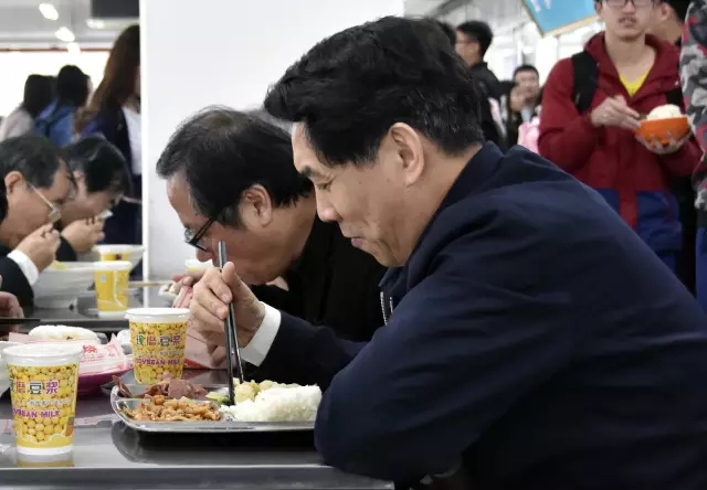 郑国光一行抵达学院先调研学生食堂。他走进北校区望舒餐厅,详细了解餐厅的伙食标准和饭菜质量、学生的学习情况和生活条件,并与学生共进午餐。他以生为本的言行、亲切的话语、和蔼的笑容,给师生留下了深刻印象。一份简单套餐和一杯豆浆,郑国光吃得津津有味。不时有同学用手机记录下这难忘的一刻。局长颜值还蛮高的!