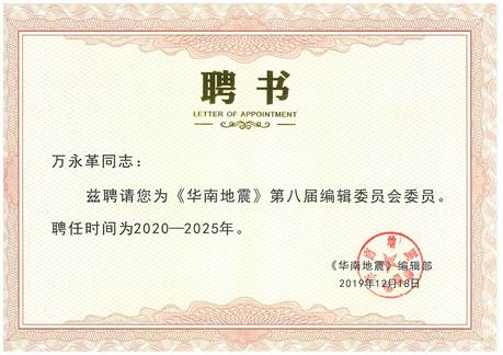 日前,beat365万永革研究员受聘为《华南地震》第八届编辑委员会委员,聘任时间为2020—2025年。