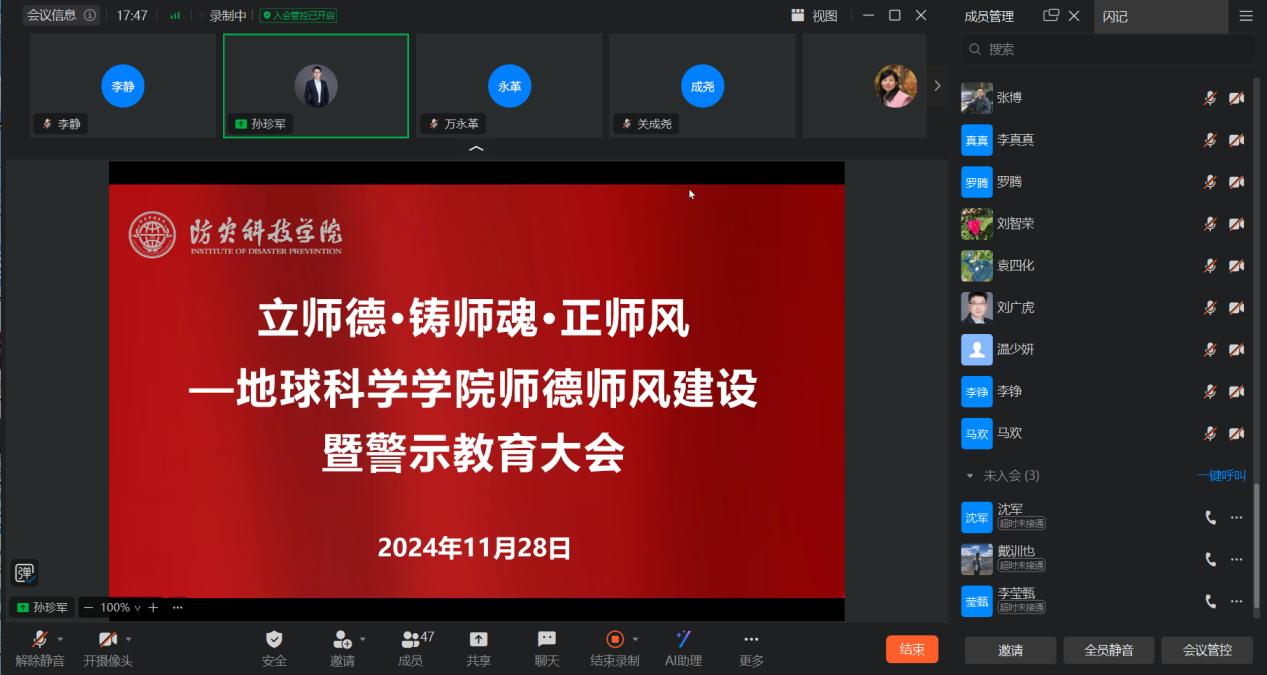 为进一步加强师德师风建设,提升教师队伍整体素质,beat365于2024年11月29日通过钉钉线上会议的形式举办了以“立师德 铸师魂 正师风”为主题的师德师风建设暨警示教育大会。会议由学院副院长孙珍军主持,全体教职工参加了此次会议。
