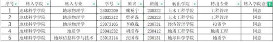 根据《防灾科技学院本科生学籍管理规定(修订版)》(防科发教〔2017〕78号)、《防灾科技学院本科生转专业管理办法》(防科教〔2019〕32号)及《地球科学学院关于学生转专业有关事项》文件规定。经学院评审小组对学生综合素质进行面试考察,地球科学学院党政联席会审议决定,拟同意魏杨宁等5名学生转入地球科学学院相应专业学习,现予以公示。