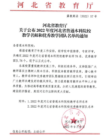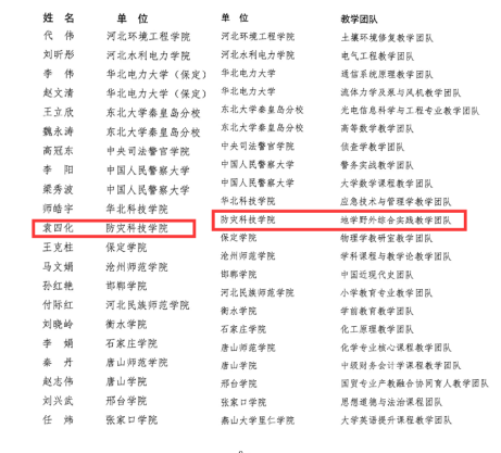 近日,河北省教育厅发布了《2022年度河北省普通本科院校教学名师和优秀教学团队名单》(冀教高函[2022]57号),以任云生教授为带头人的地学野外综合实践教学团队获评省级优秀教学团队,袁四化教授获评省级教学名师。