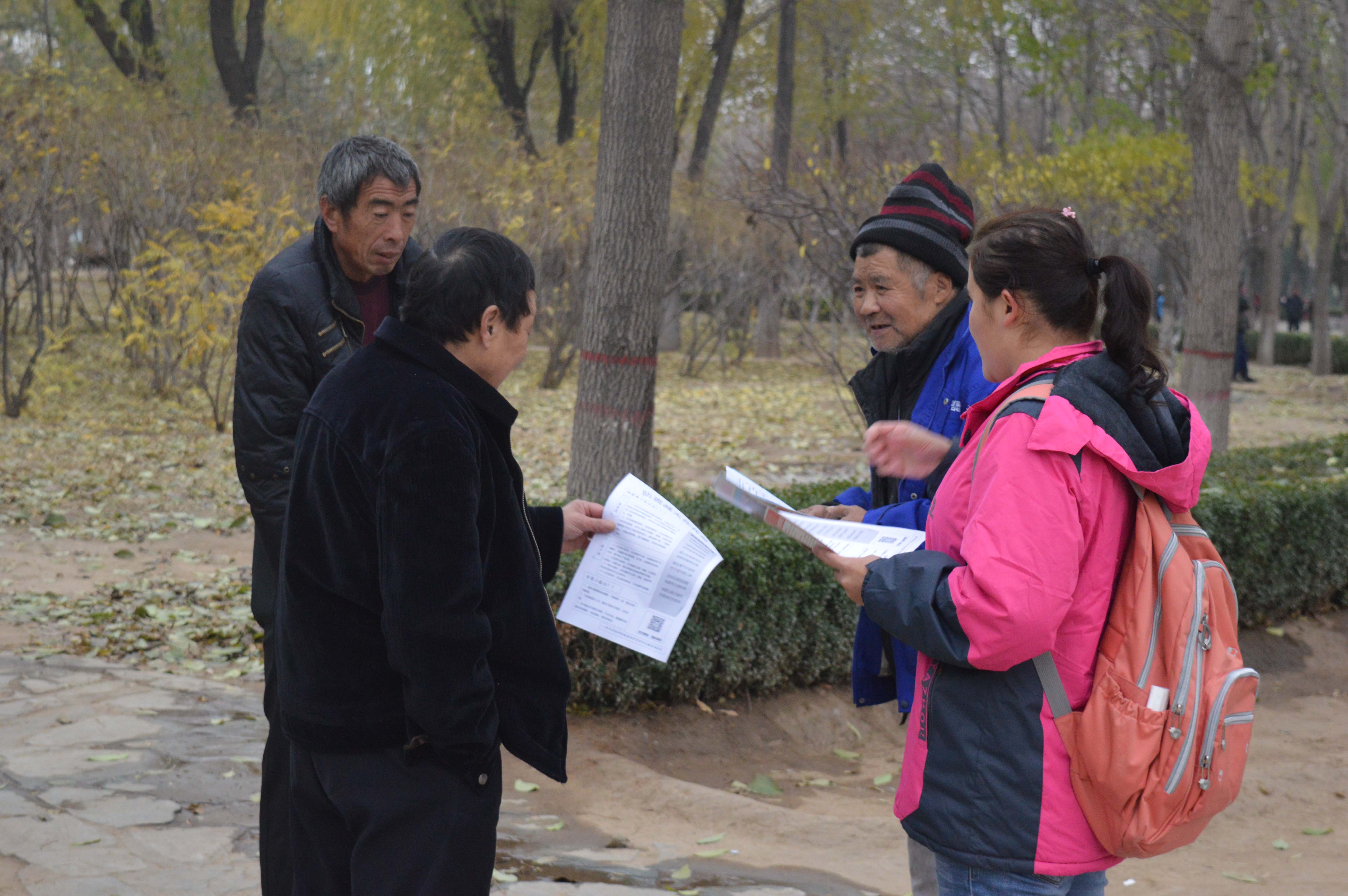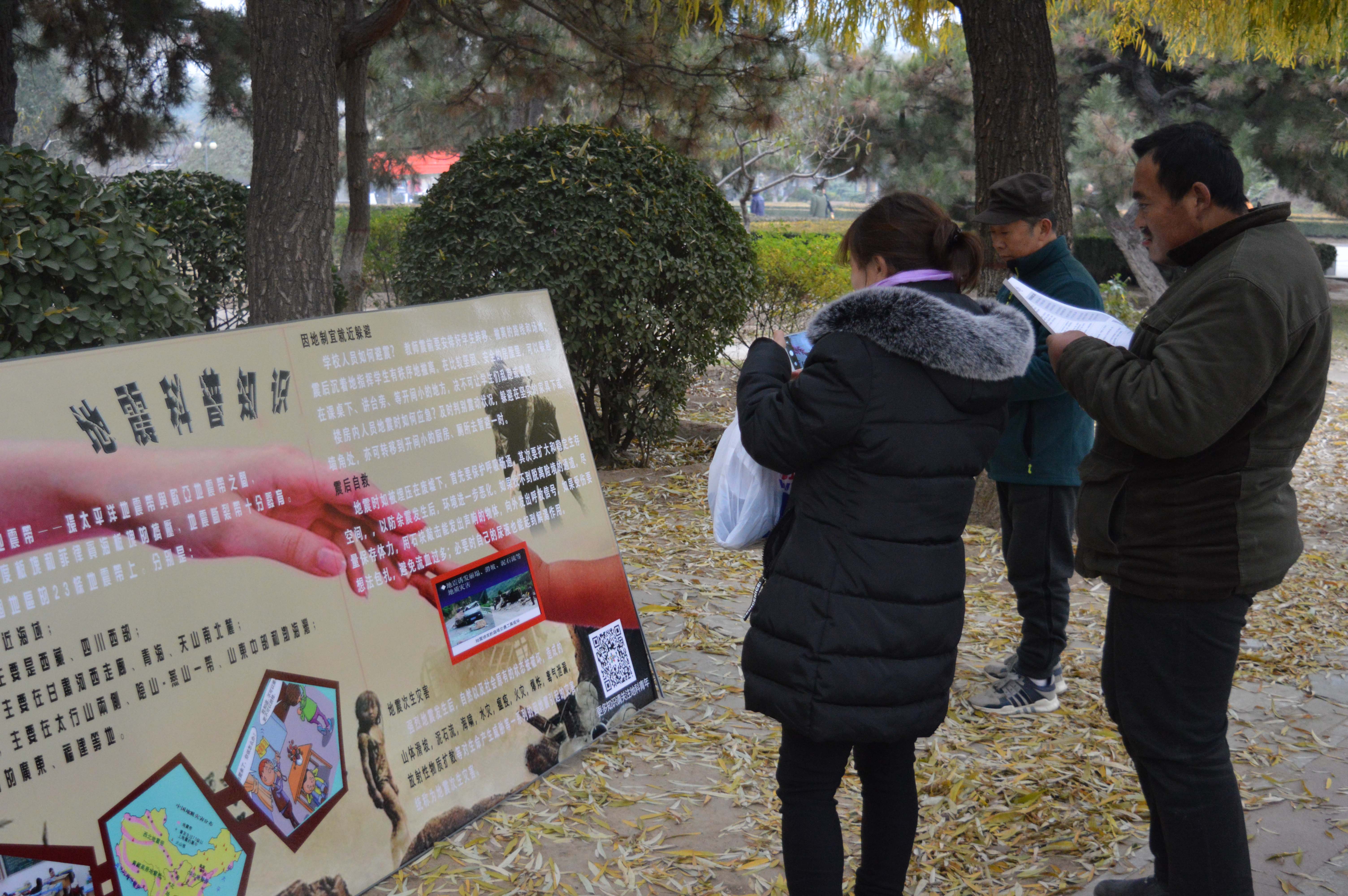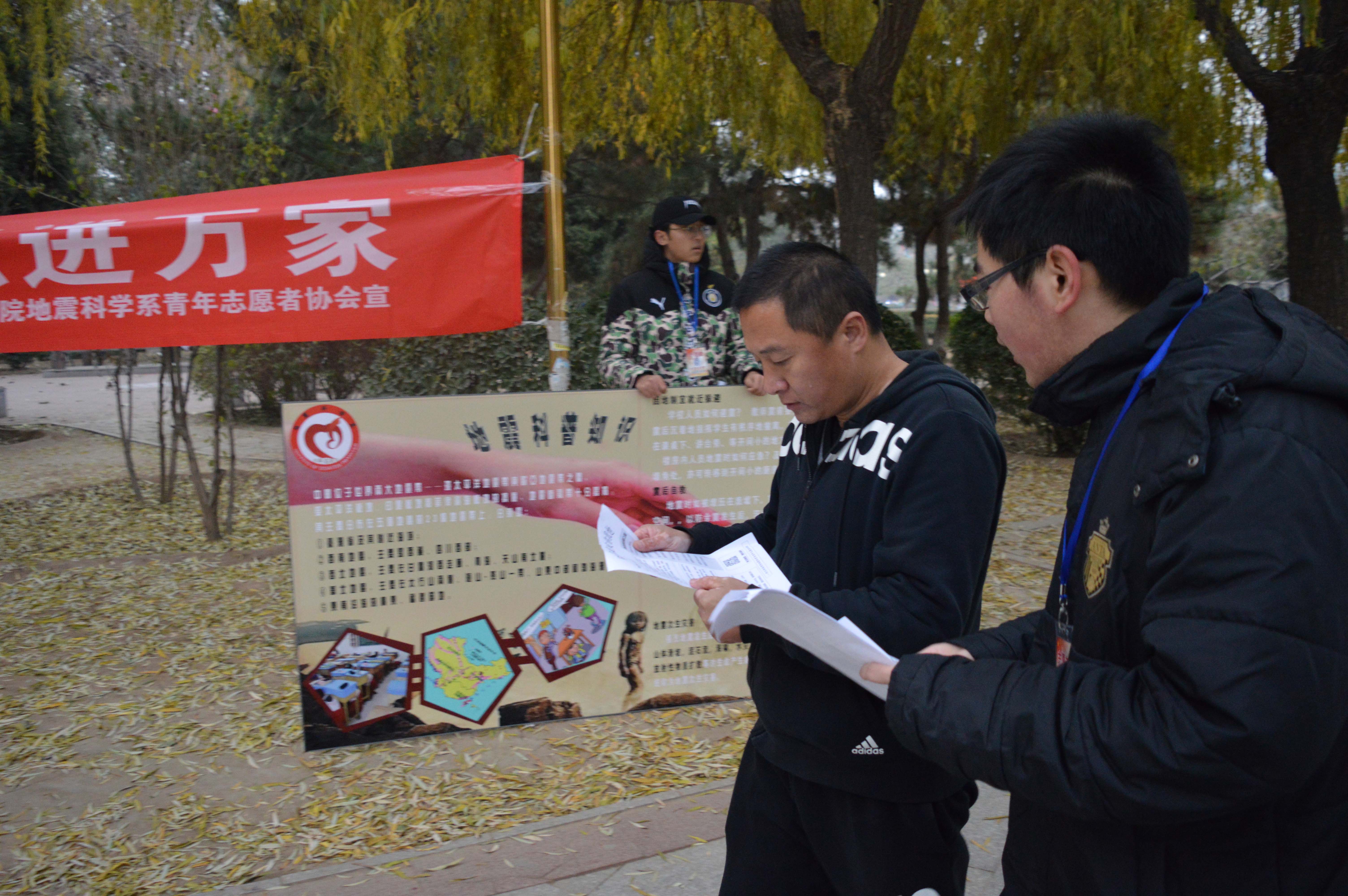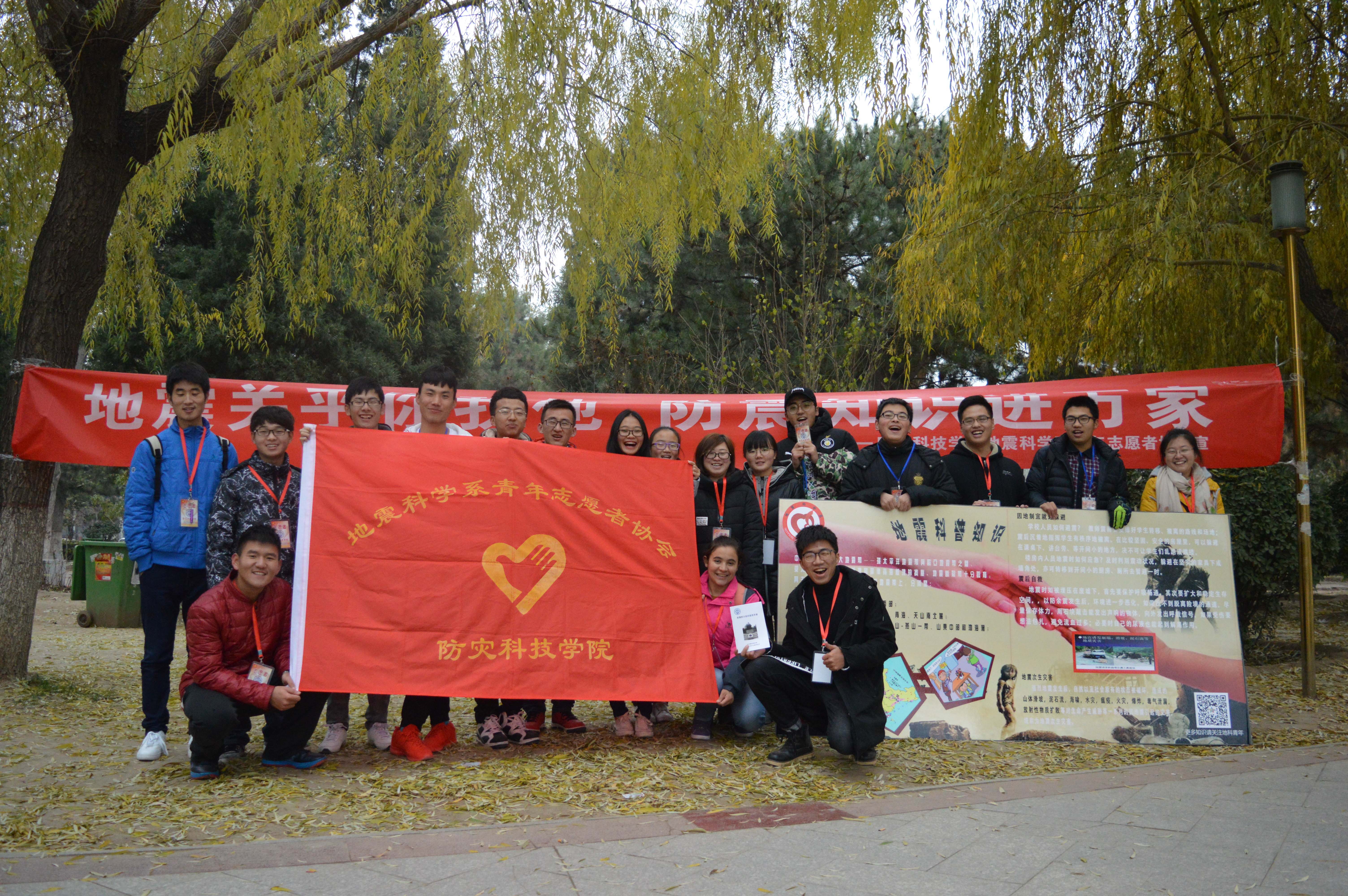 2016年11月20日下午,地震科学系青年志愿者协会组织了部分志愿者前往燕郊公园进行防震知识宣传。
