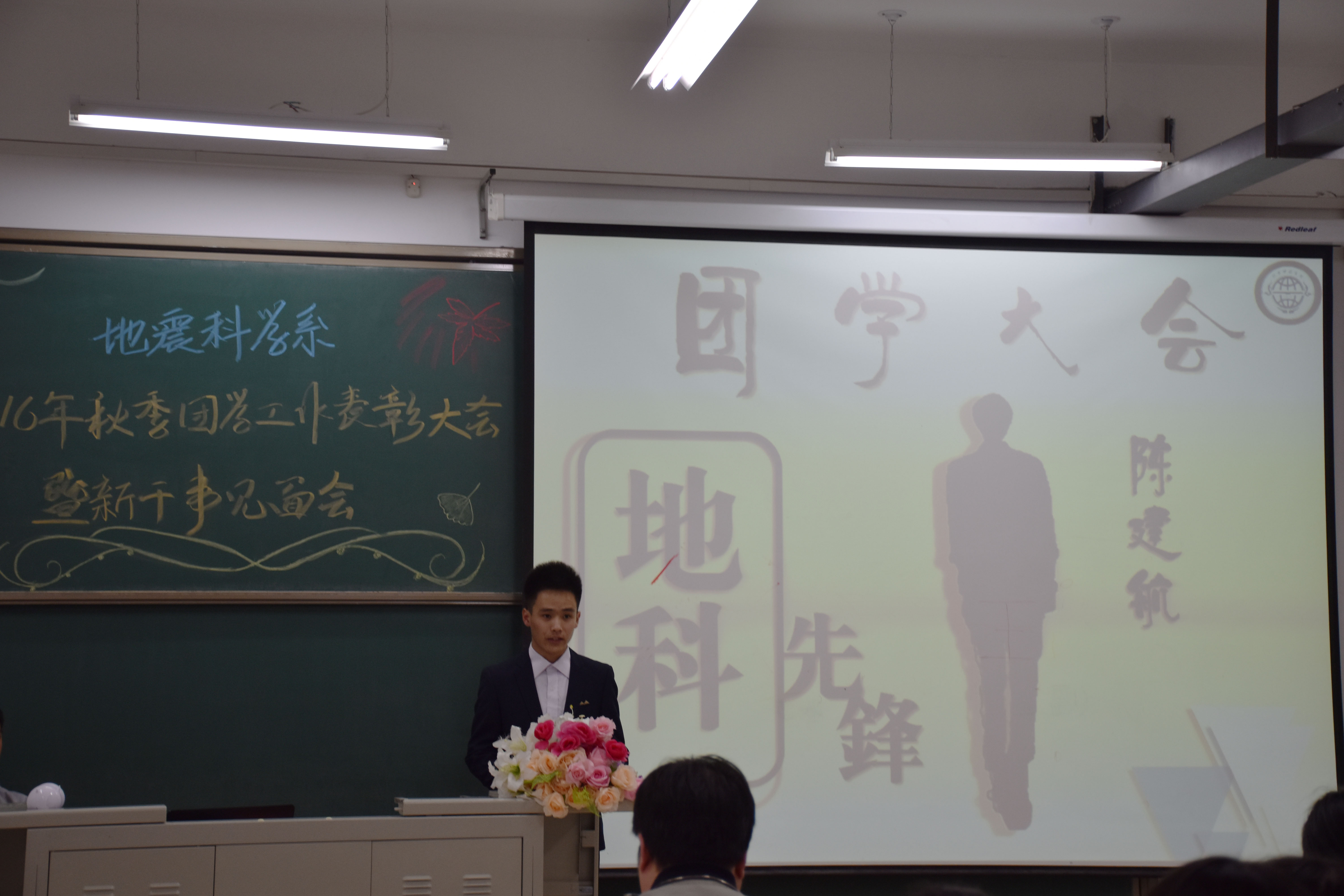 表彰大会上,王鹤、张玉琛、秦海啸、牛永君老师先后为获得团总支学生会2015-2016学年第二学期“优秀干事”、“优秀干部”、“团学工作贡献奖”和“团学工作特殊贡献奖”的同学颁发证书,牛晓龙老师代表系团总支为上届学生干部颁发“聘书”。上届学生会主席张旭、新一届团总支副书记陈建航、新任部长代表张艺潇、新干事代表吴佳怡先后上台发言。各部门新干事在部长的带领下依次上台与大家见面,口号响亮、风格各异,展现了2016级新干事们的朝气蓬勃、团结自信的精神风貌。最后地震科学系团总支书记唐圣华老师总结讲话,他对上学期的主要工作成绩进行了回顾,对本学期的工作进行了布置,他希望同学们要不忘初心,不断前行,保持积极的工作热情,团结协作,共同努力,把地震科学系的团学工作做得更好,再创佳绩。