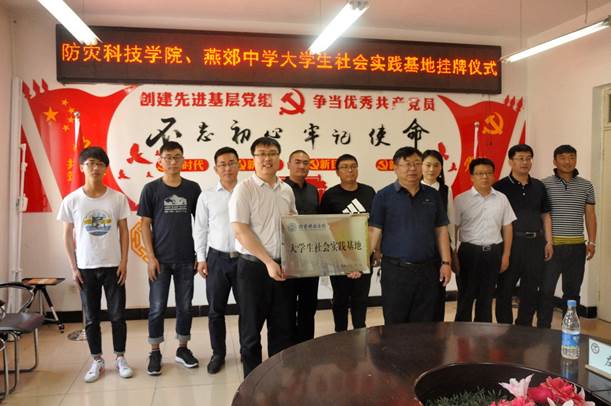 5月23日上午,防灾科技学院大学生社会实践基地挂牌仪式在燕郊中学成功举行,地球科学学院党总支书记唐圣华、党总支副书记齐路晶和燕郊中学校长梁立民、安全副校长朴春宝、德育副校长刘会兵、总务副校长柳智元、教学副校长张嗣卿、校安办主任左兵共同参加了挂牌仪式,仪式由燕郊中学常务副校长关胜龙主持。