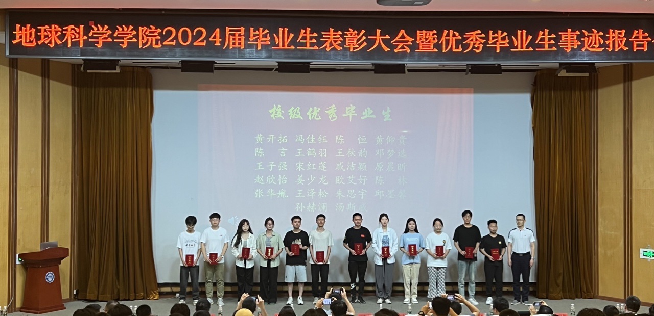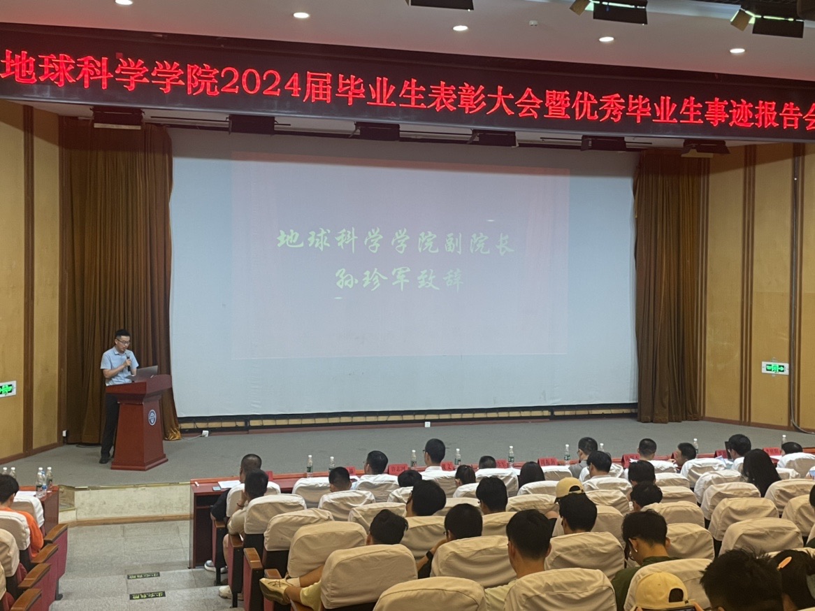 为广泛宣传优秀毕业生事迹,营造“赶、帮、超”的学习氛围,助力学院事业高质量发展。6月13日下午,地球科学学院在学校图书馆报告厅举行2024届毕业生表彰大会暨优秀毕业生事迹报告会,学校教务处处长周振海、党委学生工作部部长张伟、地球科学学院党总支书记陈灏杰、学院副院长(主持工作)孙珍军、学办主任、各教研室主任、毕业班辅导员和教师代表参加表彰大会。
