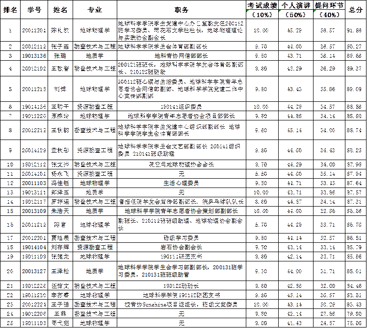 根据学院《地球科学学院学生党员发展工作实施细则(试行)》规定,按照学院党总支的安排,2022年5月5日组织党员发展对象进行了汇报答辩,答辩成绩现予以公示: